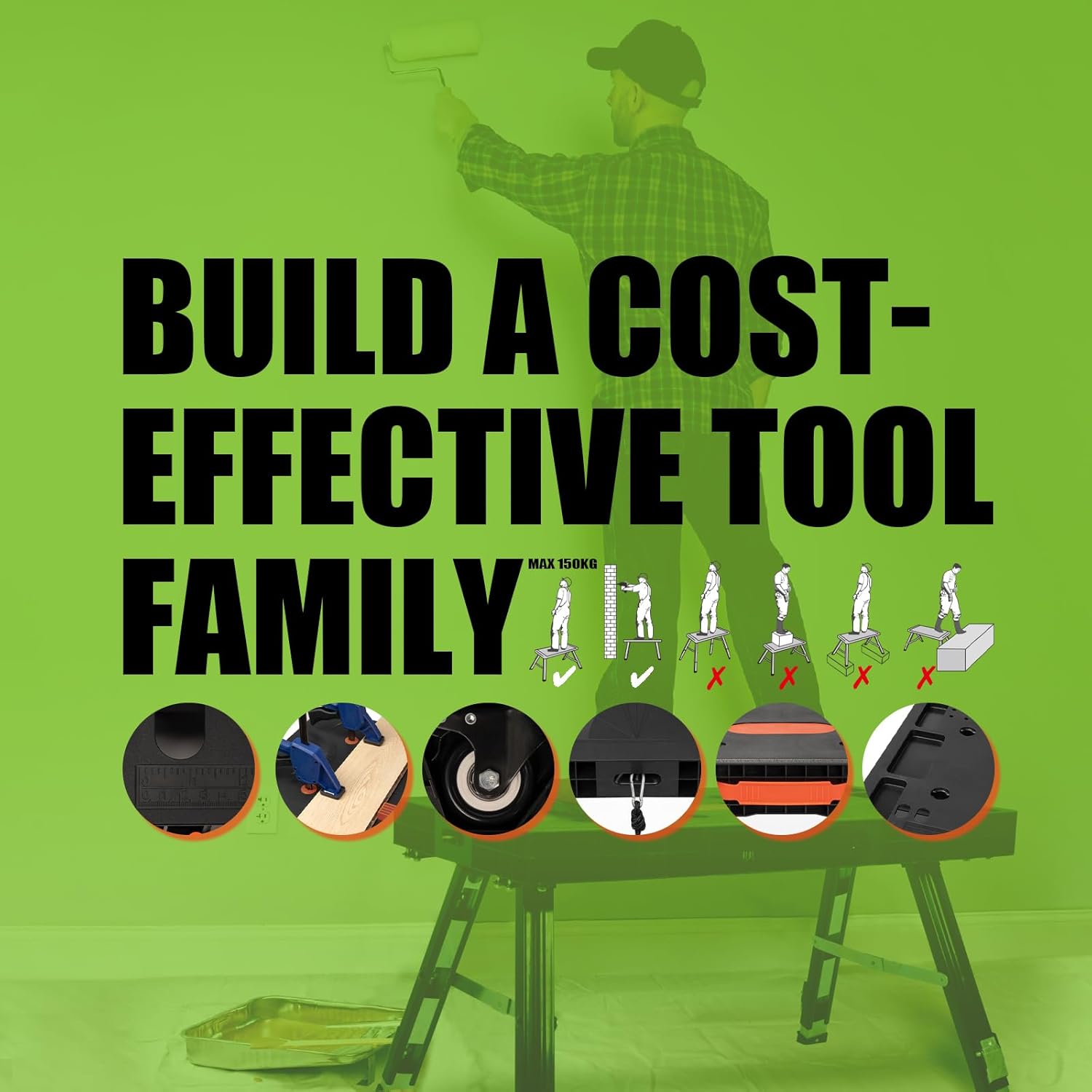 5 modes: workbench, sawhorse, scaffold, car creeper and dolly;
