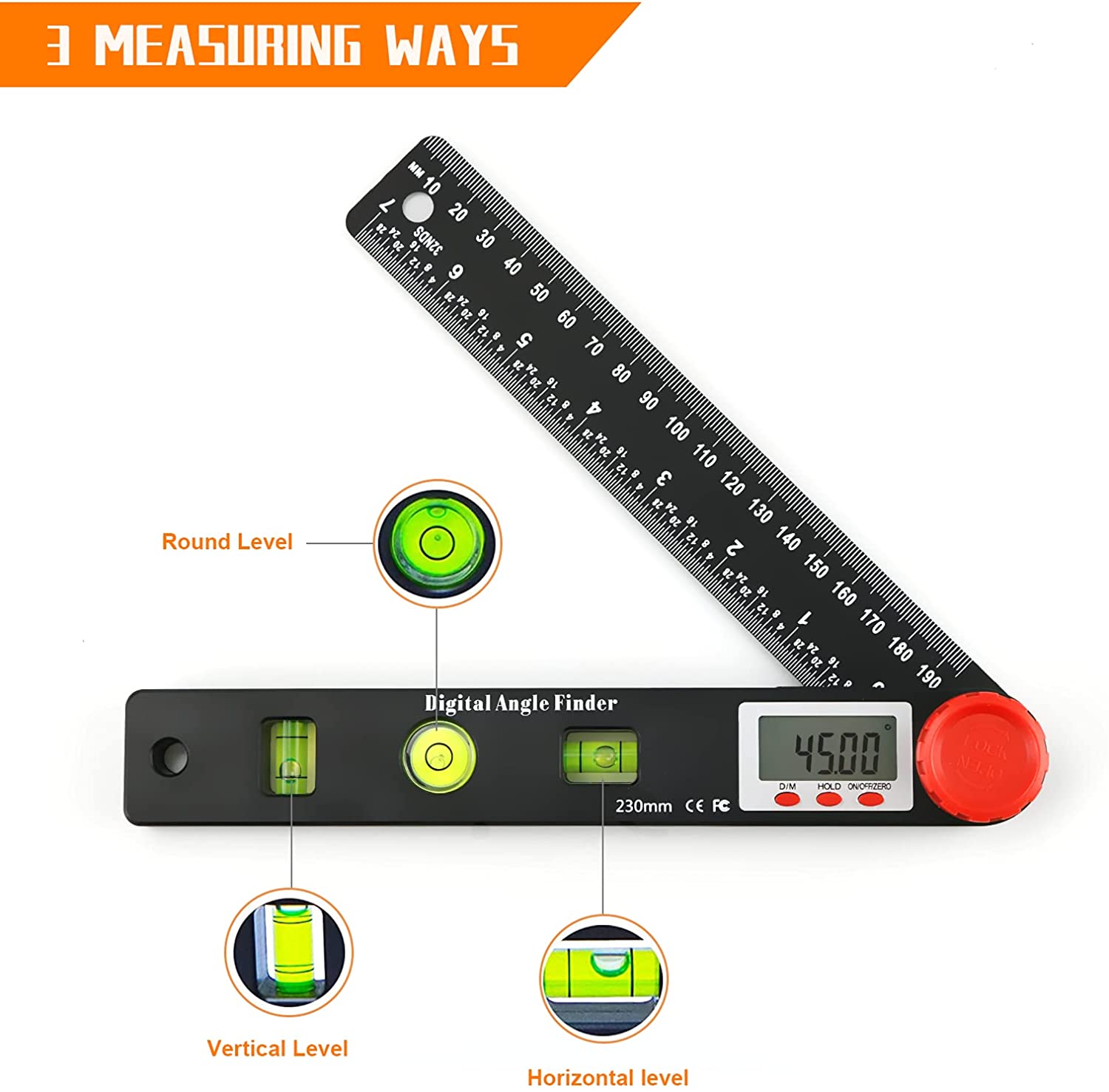 Home > GRT5027--Digital Angle Finder★【4 in 1 Woodworking Tool】Two Ways Units (inch/mm) Ruler/360° Protractor/3 Different Bubble 90°/180°/Universal Measurement Spirit Level Combination, easy to measure inside or outside angle. The digital angle detector can also be used like a spirit level (not a digital display).