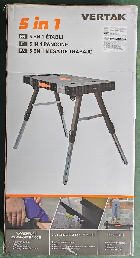 5 modes: workbench, sawhorse, scaffold, car creeper and dolly;